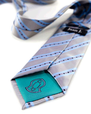 The “Jaan J. Tipping Tie” is our necktie that has the black diamond-shaped area with “Jaan J.” embroidered in gray.