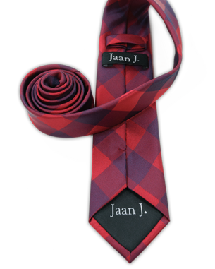 The “Jaan J. Tipping Tie” is our necktie that has the black diamond-shaped area with “Jaan J.” embroidered in gray.